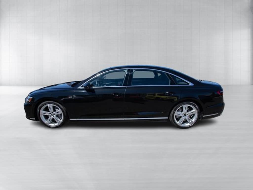 Black 2025 Audi A8 L 55 quattro quattro 8-Speed Automatic with Tiptronic 3.0L V6 Turbocharged DOHC 24V LEV3-ULEV70 335hp Black Leather, 17 Speakers, 22-Way Multi-Contour Comfort Front Seats, 4-Wheel Disc Brakes, ABS brakes, Adaptive Cruise Assist w/Lane Guidance, Adaptive suspension, Air Conditioning, Alloy wheels, Alu-Optic Buttons, AM/FM radio: SiriusXM, Audi Guard Protection Kit, Audi Side Assist w/Pre Sense Rear, Auto High-beam Headlights, Auto tilt-away steering wheel, Auto-dimming door mirrors, Auto-dimming Rear-View mirror, Auto-leveling suspension, Automatic temperature control, Bang & Olufsen Premium Sound System w/3D Sound, Brake assist, Bumpers: body-color, Compass, Delay-off headlights, Driver door bin, Driver vanity mirror, Dual front impact airbags, Dual front side impact airbags, Dual-Pane Acoustic Glass for Side Windows, Dynamic All-Wheel-Steering, Dynamic Center Caps, Electronic Stability Control, Emergency communication system: Audi connect CARE, PRIME & PLUS, Executive Package, Extended Leather Package, Exterior Parking Camera Rear, Four wheel independent suspension, Front anti-roll bar, Front Bucket Seats, Front Center Armrest w/Storage, Front dual zone A/C, Front fog lights, Front reading lights, Front Seat Massage Function, Garage door transmitter: HomeLink, Genuine wood door panel insert, HD Matrix-Design LED Headlights, Head restraints memory, Head-Up Display, Headlight Washers, Heated door mirrors, Heated Front Seat Armrests, Heated front seats, Heated Rear Seats, HVAC memory, Illuminated entry, Illuminated Front Audi Rings, Intersection Assist, Knee airbag, Leather Shift Knob, Leather steering wheel, LED Interior Lighting Plus Package, Low tire pressure warning, Luxury Package, Memory seat, Navigation system: MMI Navigation plus, Occupant sensing airbag, Outside temperature display, Overhead airbag, Overhead console, Panic alarm, Passenger door bin, Passenger vanity mirror, Power 2nd-Row Moonroof, Power adjustable front head restraints, Power door mirrors, Power driver seat, Power moonroof, Power passenger seat, Power steering, Power windows, Radio data system, Radio: Audi MMI Navigation Plus, Rain sensing wipers, Rear air conditioning, Rear anti-roll bar, Rear dual zone A/C, Rear fog lights, Rear reading lights, Rear seat center armrest, Rear side impact airbag, Rear Window Blind, Rear window defroster, Remote keyless entry, Remote Park Assist Plus, Seatbelt memory, Security system, Speed control, Speed-sensing steering, Speed-Sensitive Wipers, Steering wheel memory, Steering wheel mounted audio controls, Tachometer, Telescoping steering wheel, Tilt steering wheel, Traction control, Trip computer, Turn signal indicator mirrors, Valcona Leather Seat Upholstery, Valetta Leather Seat Upholstery, Variably intermittent wipers, Ventilated front seats, Wheels: 20" 5-Spoke Design, Black Leather.